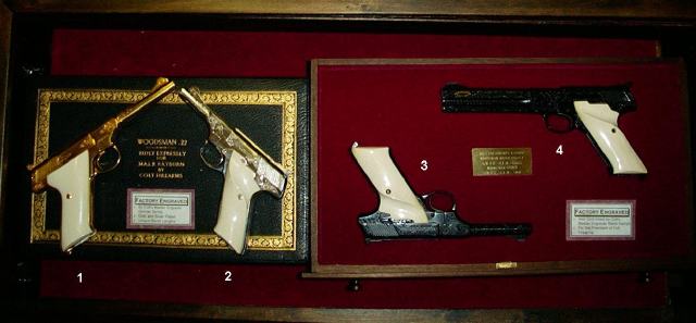 Right side pair was built and cased by Colt for the personal collection of Mr. Charles E. Warner, President of Colt Firearms from August of 1975 through May of 1981. Each bears a special "PRESIDENT'S EDITION" logo inlaid in gold, and the serial number of each consists of P.E. (for President's Edition), C.E.W. (Mr. Warner's initials), and the model number of the pistol: S1141 and S3162 for the Sport and Match Target, respectively. Ivory stocks added by present owner.